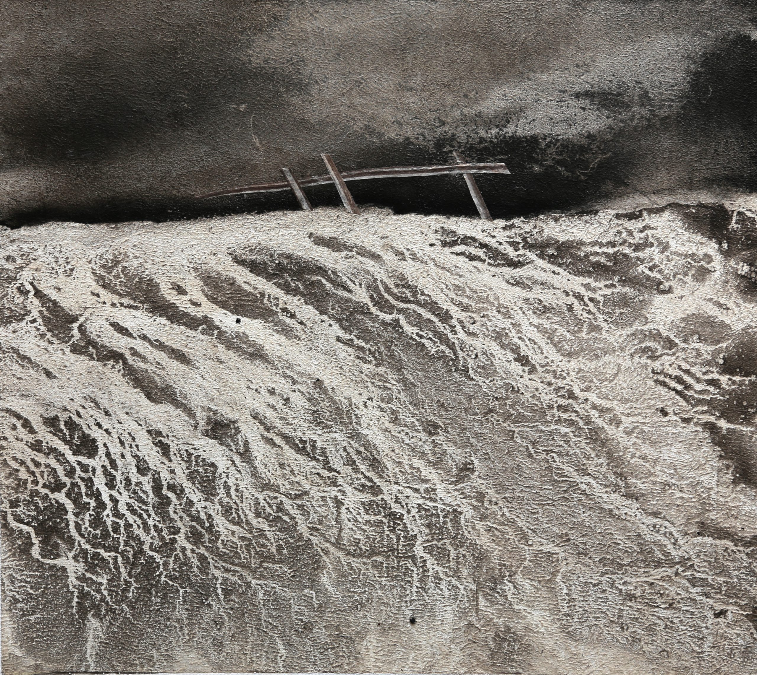 Per arrivare al massimo della potenzialità espressiva dell’inchiostro, sceglie di lavorare su tela anziché sulla carta di riso, arricchendo la superficie con pigmenti, scaglie di minerali, sabbia, collage di carta e calligrafie della tradizione orientale.
